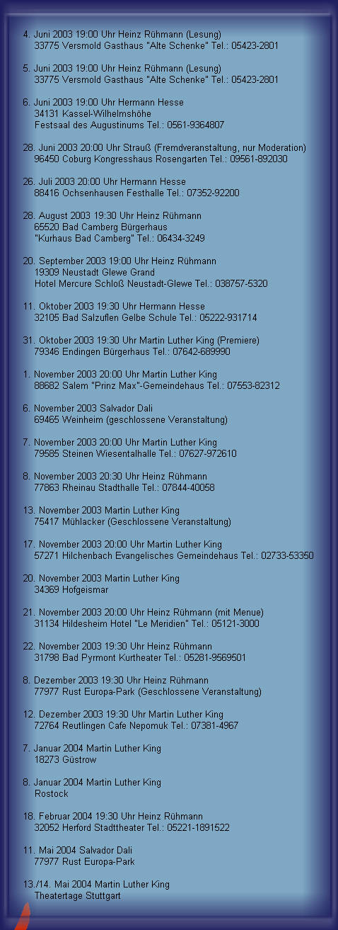| 69465 Weinheim (geschlossene Veranstaltung) 7. November 2003 20:00 Uhr Martin Luther King 79585 Steinen Wiesentalhalle Tel.: 07627-972610 8. November 2003 20:30 Uhr Heinz Rühmann 77863 Rheinau Stadthalle Tel.: 07844-40058 13. November 2003 Martin Luther King 75417 Mühlacker (Geschlossene Veranstaltung) 17. November 2003 20:00 Uhr Martin Luther King 57271 Hilchenbach Evangelisches Gemeindehaus Tel.: 02733-53350 20. November 2003 Martin Luther King 34369 Hofgeismar 21. November 2003 20:00 Uhr Heinz Rühmann (mit Menue) 31134 Hildesheim Hotel "Le Meridien" Tel.: 05121-3000 22. November 2003 19:30 Uhr Heinz Rühmann 31798 Bad Pyrmont Kurtheater Tel.: 05281-9569501 8. Dezember 2003 19:30 Uhr Heinz Rühmann 77977 Rust Europa-Park (Geschlossene Veranstaltung) 12. Dezember 2003 19:30 Uhr Martin Luther King 72764 Reutlingen Cafe Nepomuk Tel.: 07381-4967 7. Januar 2004 Martin Luther King 18273 Güstrow 8. Januar 2004 Martin Luther King Rostock 18. Februar 2004 19:30 Uhr Heinz Rühmann 32052 Herford Stadttheater Tel.: 05221-1891522 |